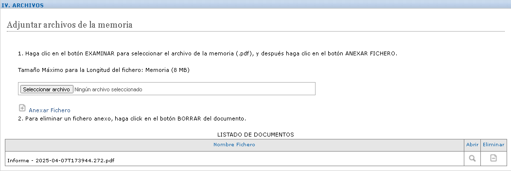 En esta opción se adjuntan archivos de la memoria a la solicitud que sean de extension pdf y el la longitud máxima 8MB. Para ello apretamos botón seleccionar archivo desde una ubicación física y después apretamos anexar fichero. Existiendo la posibilidad de abrir o eliminar dicho archivo. |
