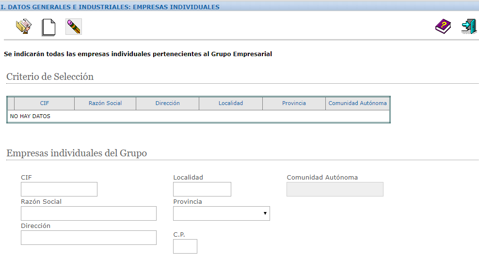 En esta pantalla se recogen los datos identificativos de las empresas individuales pertenecientes a un grupo empresarial como: CIF, dirección, localidad... A partir de esta pantalla se pueden dar de alta nuevas empresas individuales pertenecientes al grupo, modificar empresas existentes e incluso eliminar alguna de ellas.