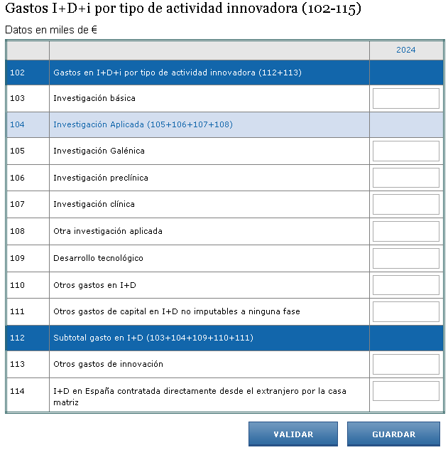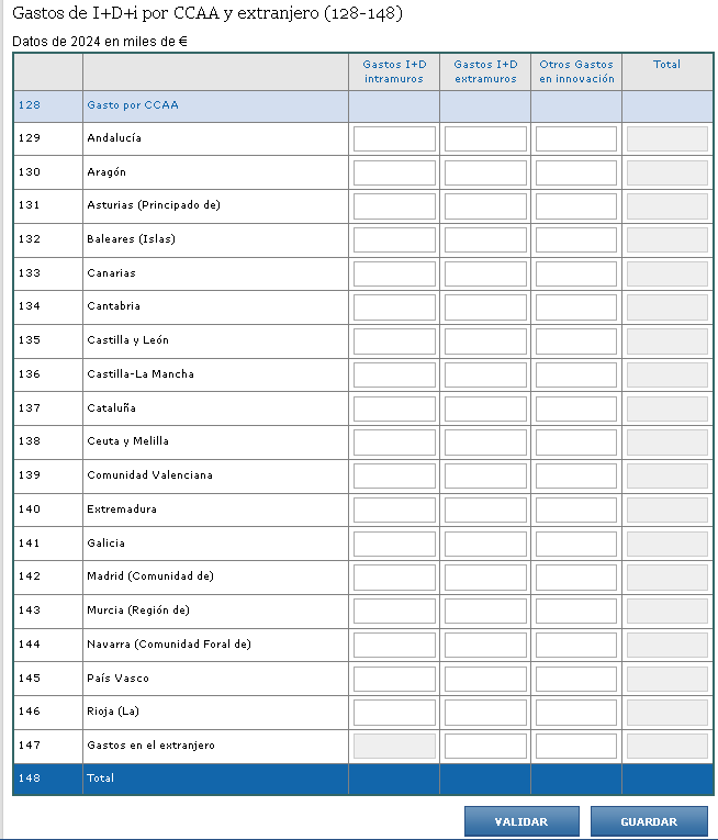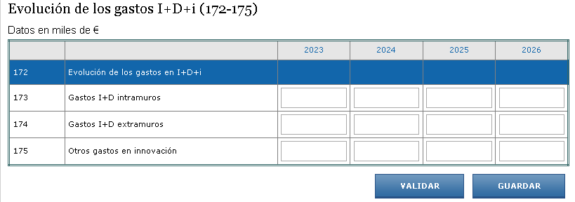 Los Gastos de I+D intramuros (L.173.) para el año 2024 debe coincidir con el total de gastos intramuros (L.148) en Gastos de I+D+i por CCAA y extranjero . Los Gastos de I+D extramuros (L.174.) para el año 2024 debe coincidir con el total de gastos extramuros (L.148) en Gastos de I+D+i por CCAA y extranjero . Otros gastos en innovación (L.175.) para el año 2024 debe coincidir con el total de Otros Gastos Innovación (L.148) en Gastos de I+D+i por CCAA y extranjero . |