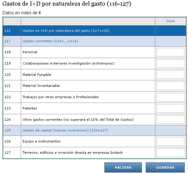 Material Fungible (L.120.): Por material fungible se entiende todo el material no inventariable. Trabajos realizados por otras empresas y profesionales (L.122.): Comprende lo abonado a otras empresas por la prestación de servicios. Patentes (L.123.): Especificar exclusivamente el gasto de patentes. Otros gastos corrientes (L.124.): Este importe no superará el 10% del total de gastos de I+D (L.116.). y comprenderá todos los demás gastos no incluidos en los apartados anteriores.