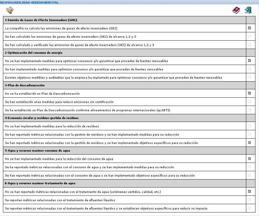 Este grupo de Responsabilidad ambiental (que tiene 6 agrupaciones) es obligatorio marcar una opción, y sólo una, de cada agrupación (no es posible marcar más de una opción de cada agrupación). Cuando se marca una opción de la agrupación, las otras opciones se bloquean. Si se quiere escoger otra opción se ha de desmarcar la opción seleccionada, así se desbloquean la otras opciones y así se puede volver a marcar.