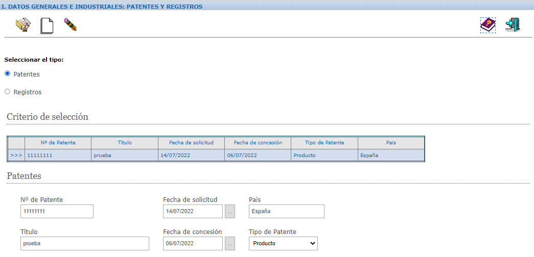 | Cumplimentación de Datos Relativos a Patentes y Registros |