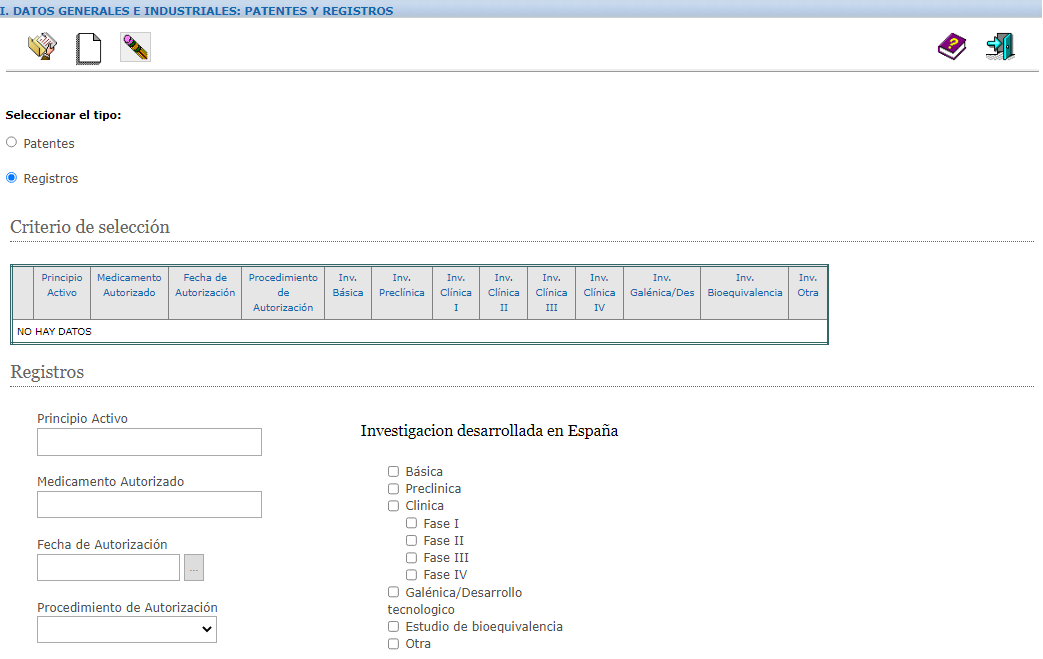 A partir de esta pantalla se pueden dar de alta nuevas patentes solicitadas por la empresa en los últimos cinco años o Moléculas registradas por la empresa en los últimos cinco años , modificar datos de dichas patentes y registros e incluso eliminar alguna de ellas.